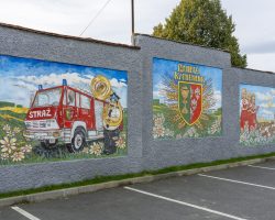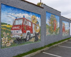 Mural nawiązuje do historii i tradycji kulturowych wsi, w której istotna rolę odgrywają działania miejscowej OSP i zespołu muzycznego.