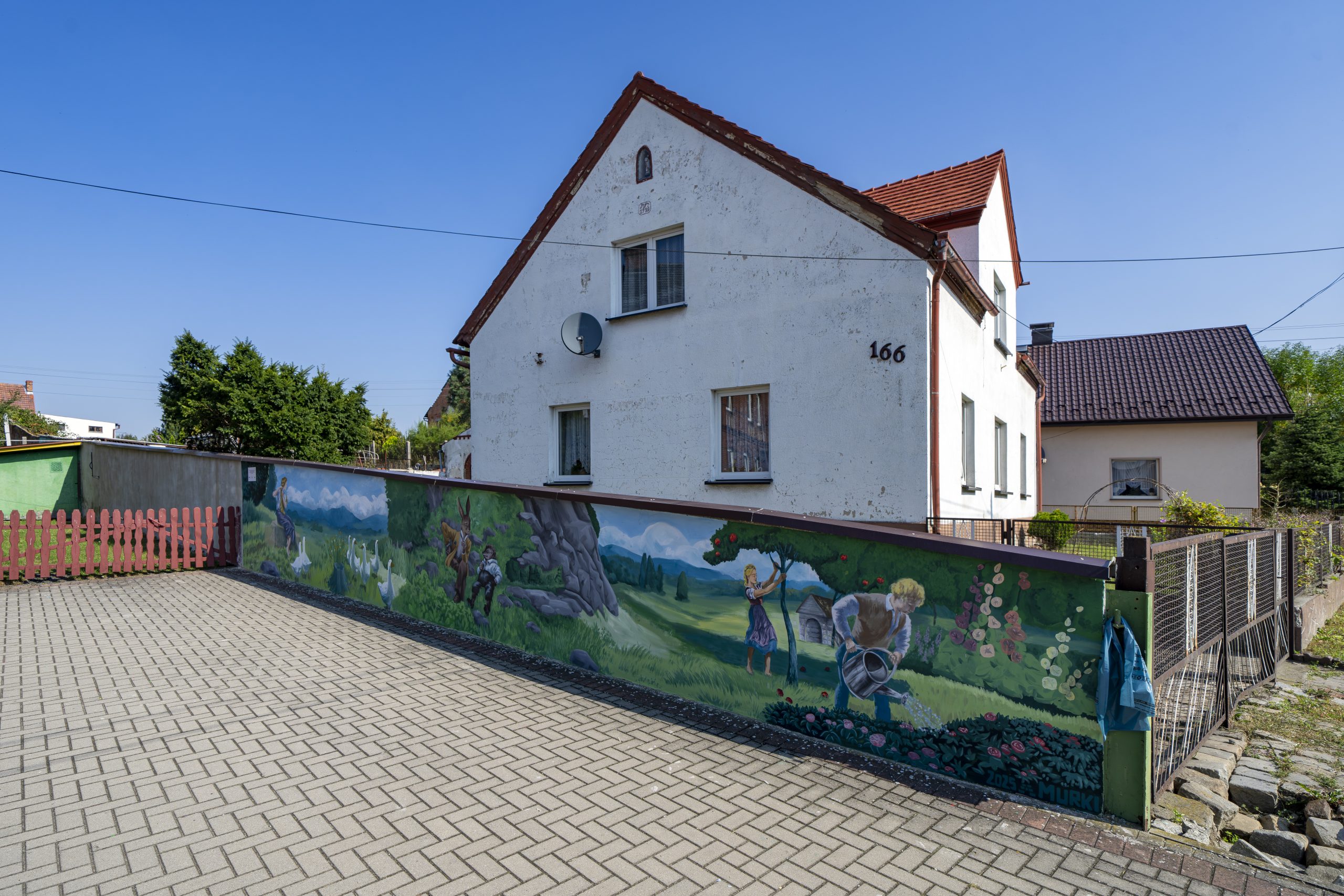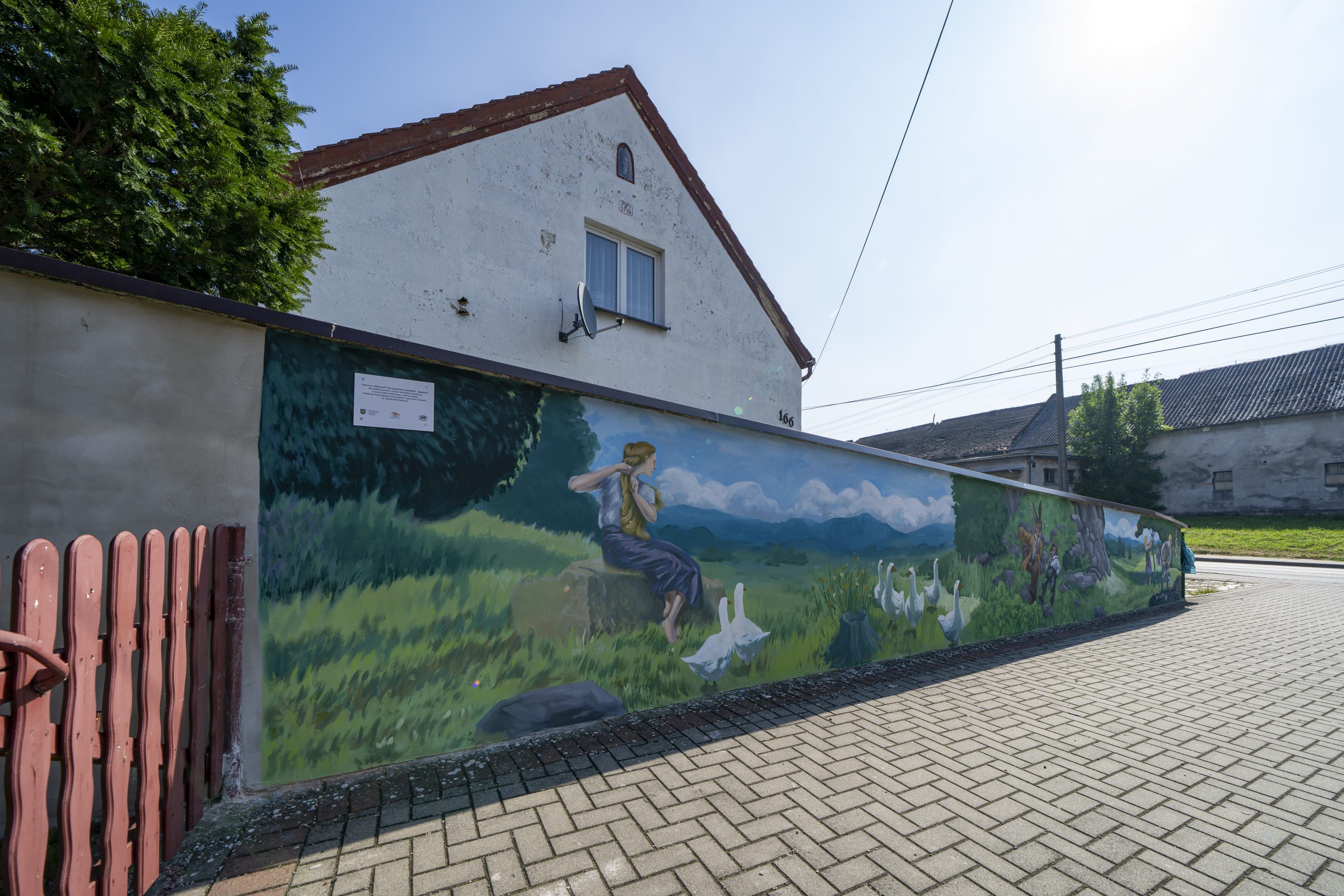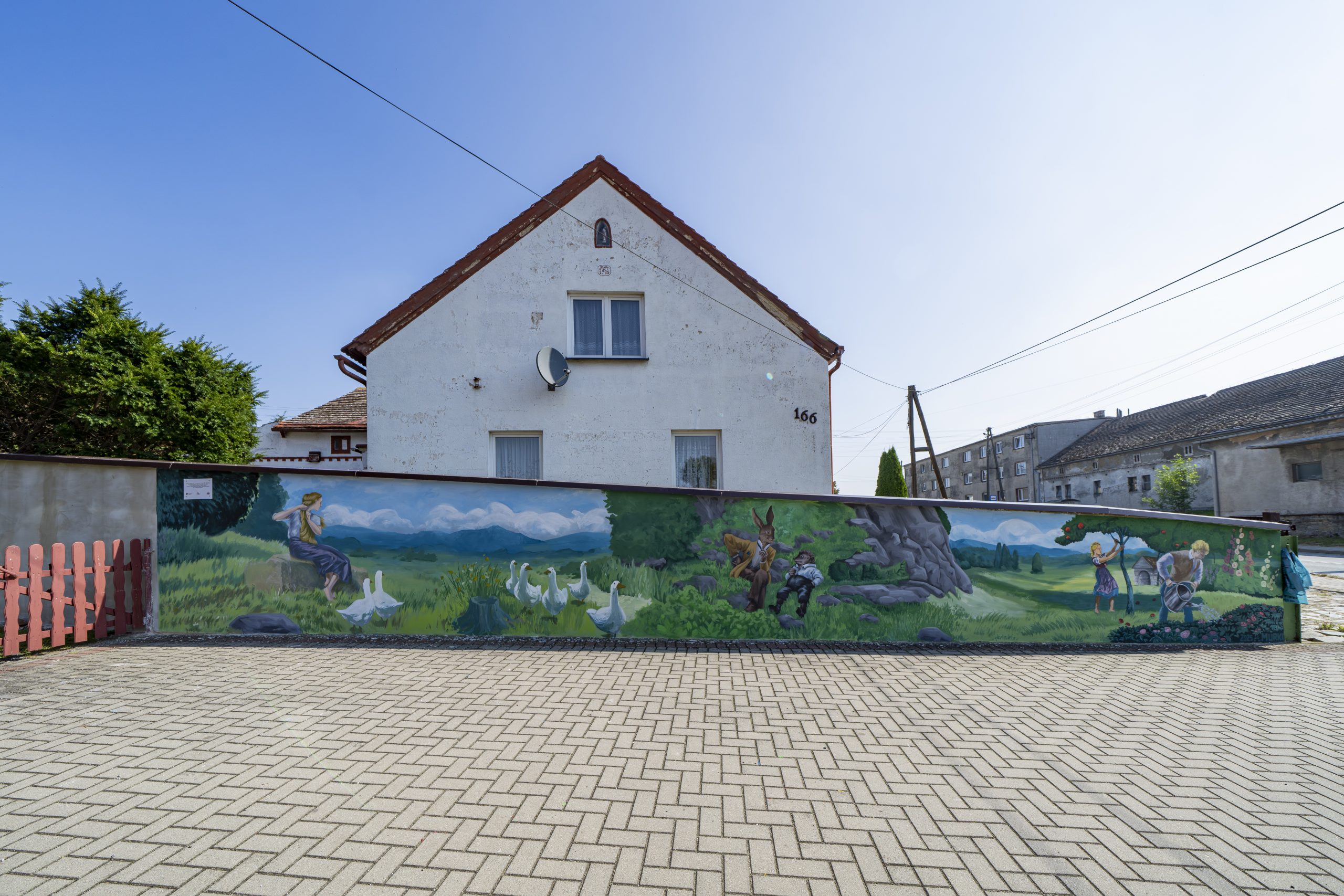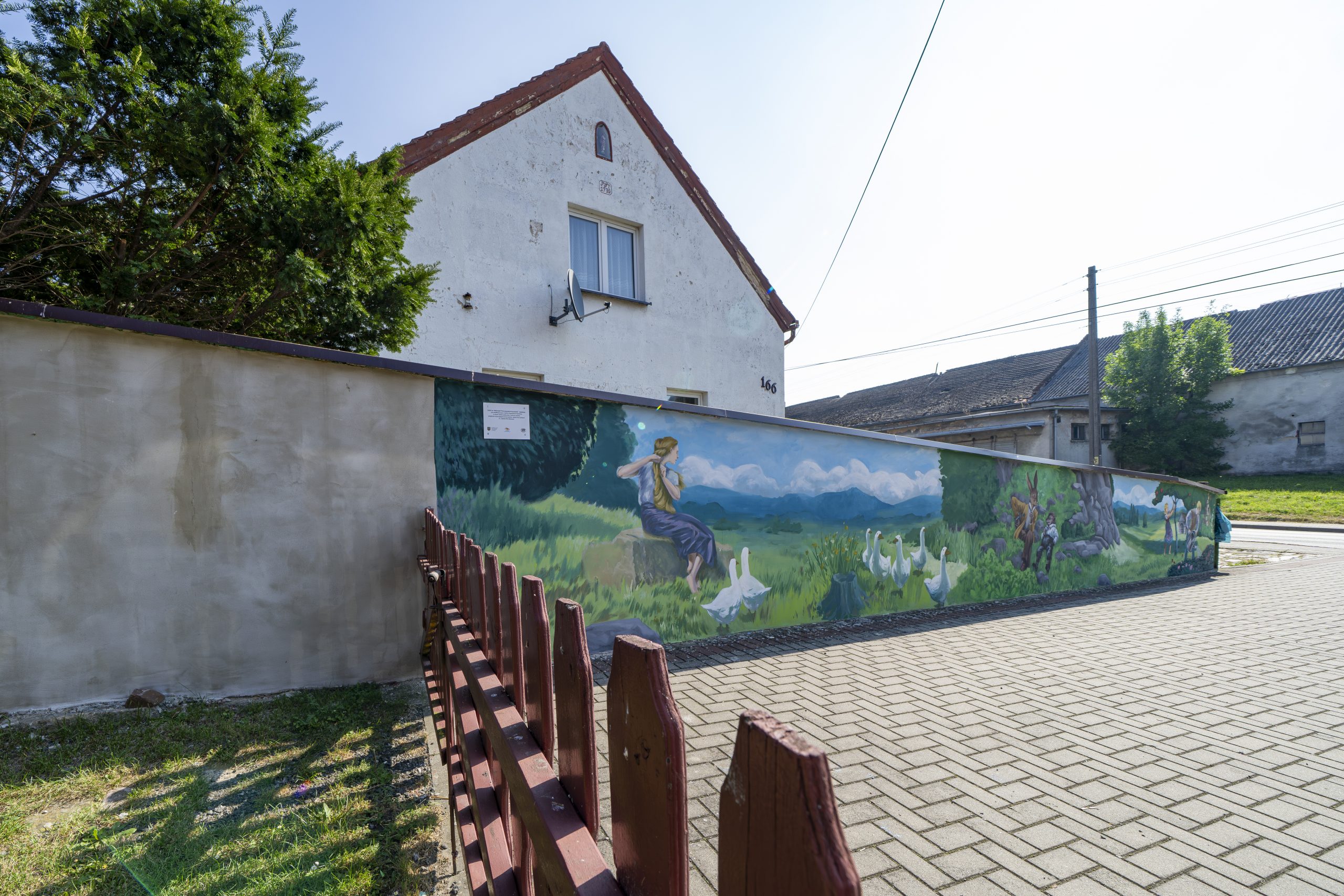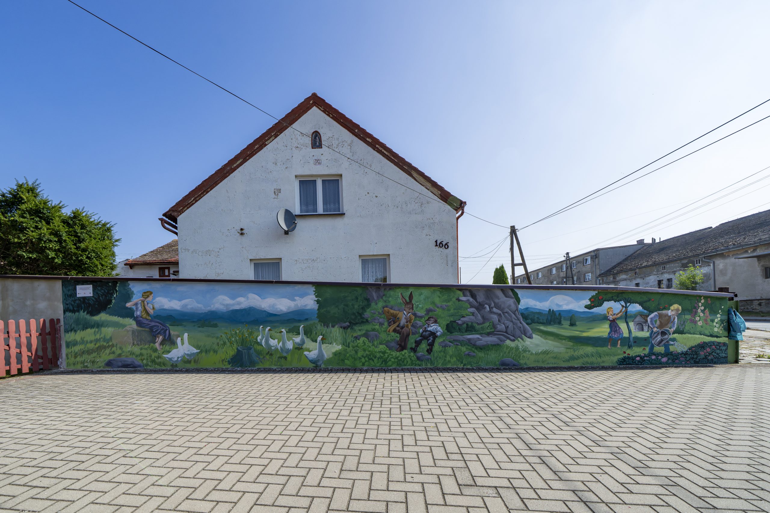 - Mural na murku przy przedszkolu, skierowany do najmłodszych mieszkańców wsi. Jego tematyka związana jest z fauną i florą, co dodatkowo wprowadza element edukacyjny i estetyczny <br> do przestrzeni przedszkolnej.
