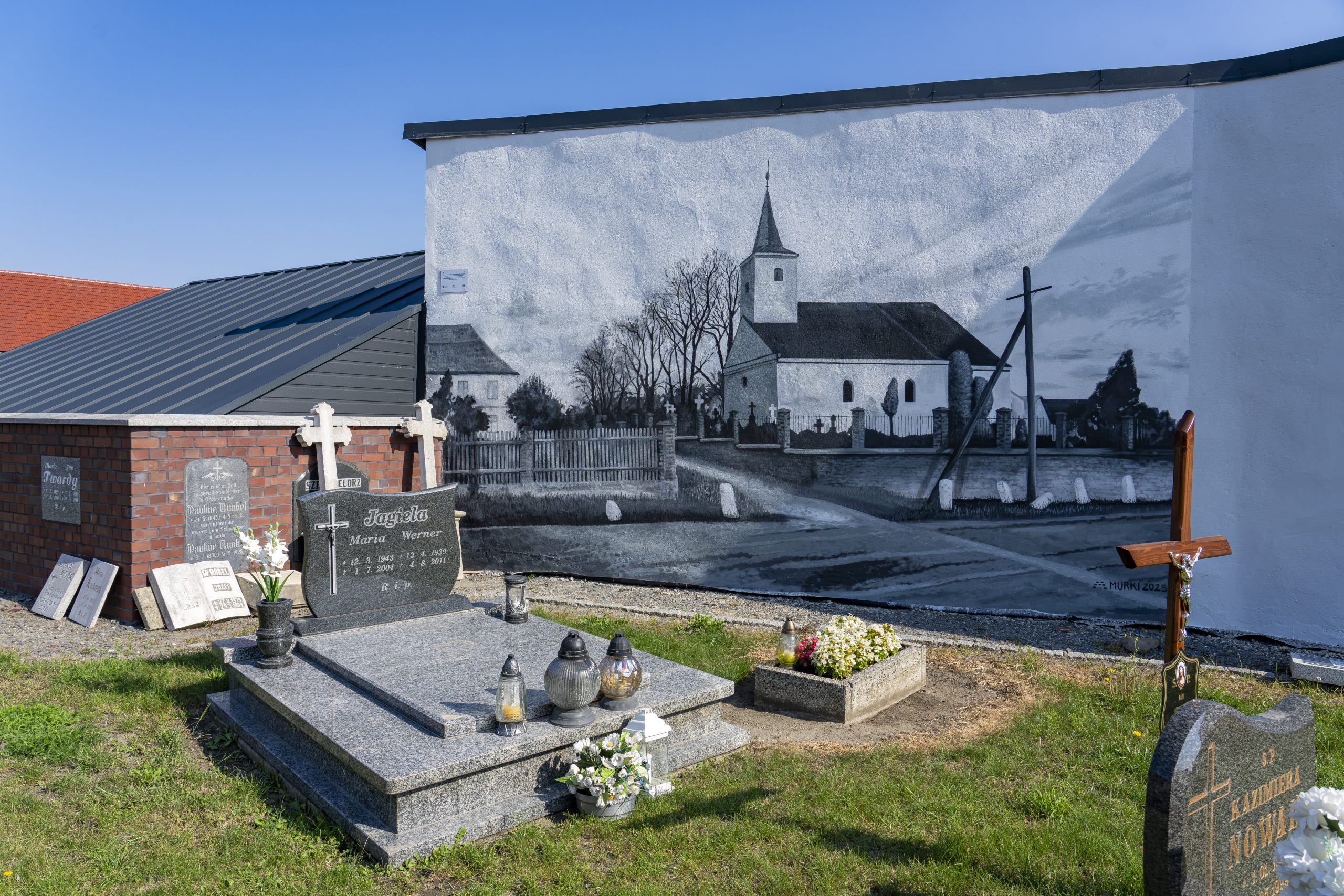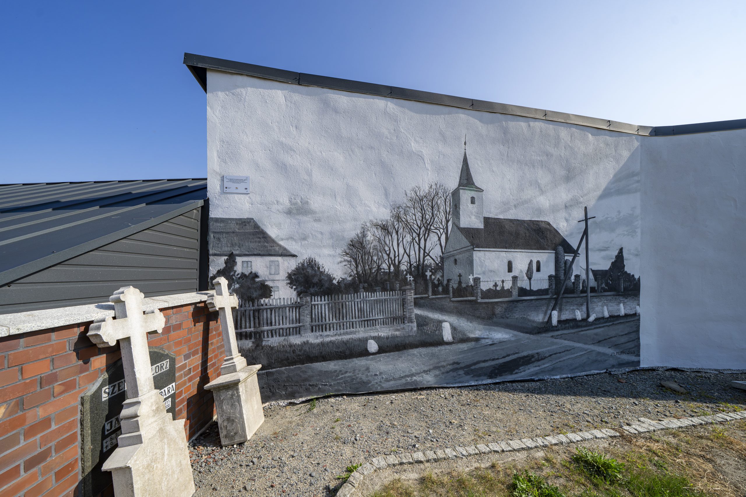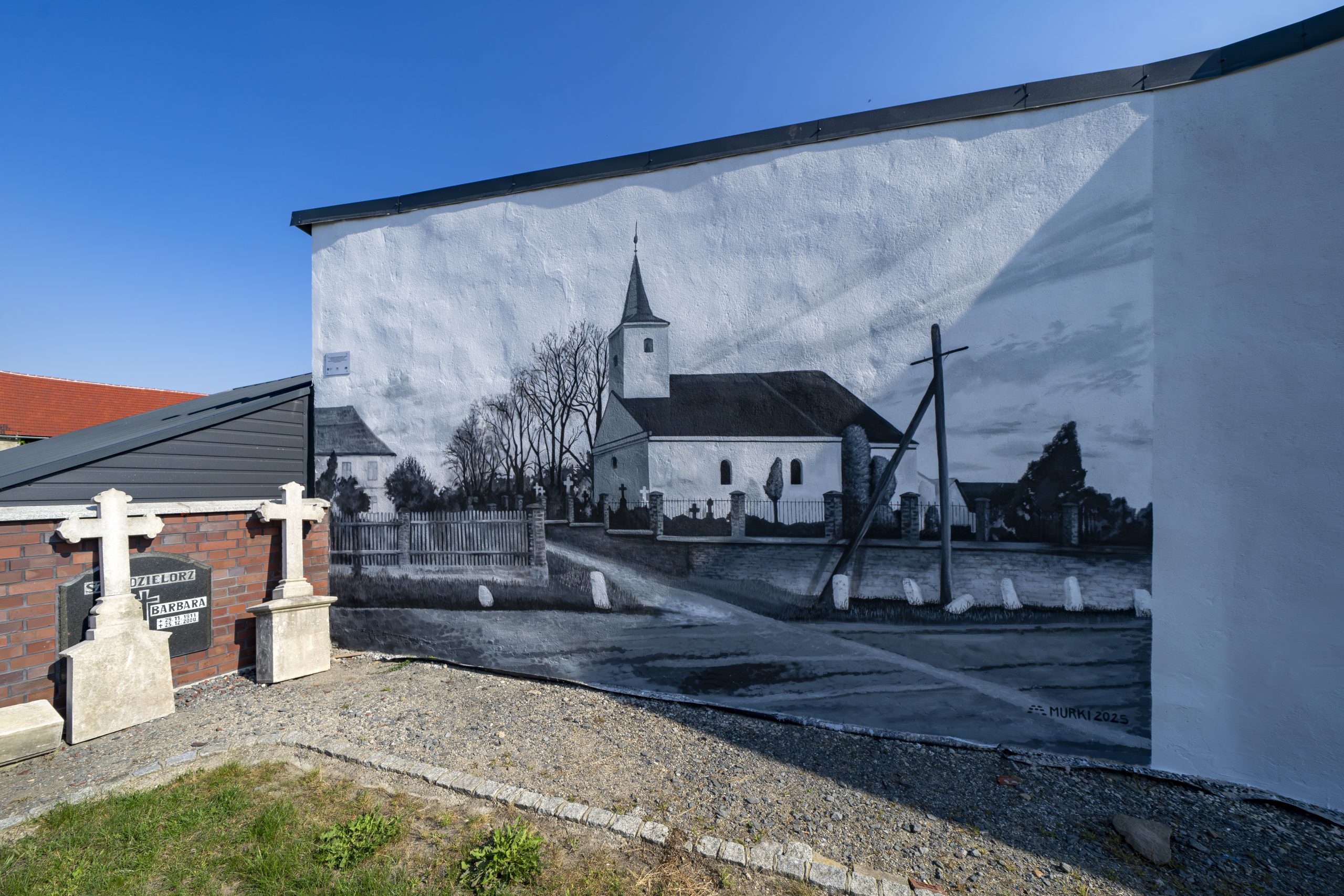 - Mural na ścianie szopy przylegającej do terenu kościoła parafialnego. Tematyka malowidła nawiązuje do archiwalnych fotografii zgromadzonych w „Farskiej Stodole”, ukazując m.in. wygląd świątyni sprzed rozbudowy oraz elementy śląskich tradycji funeralnych.