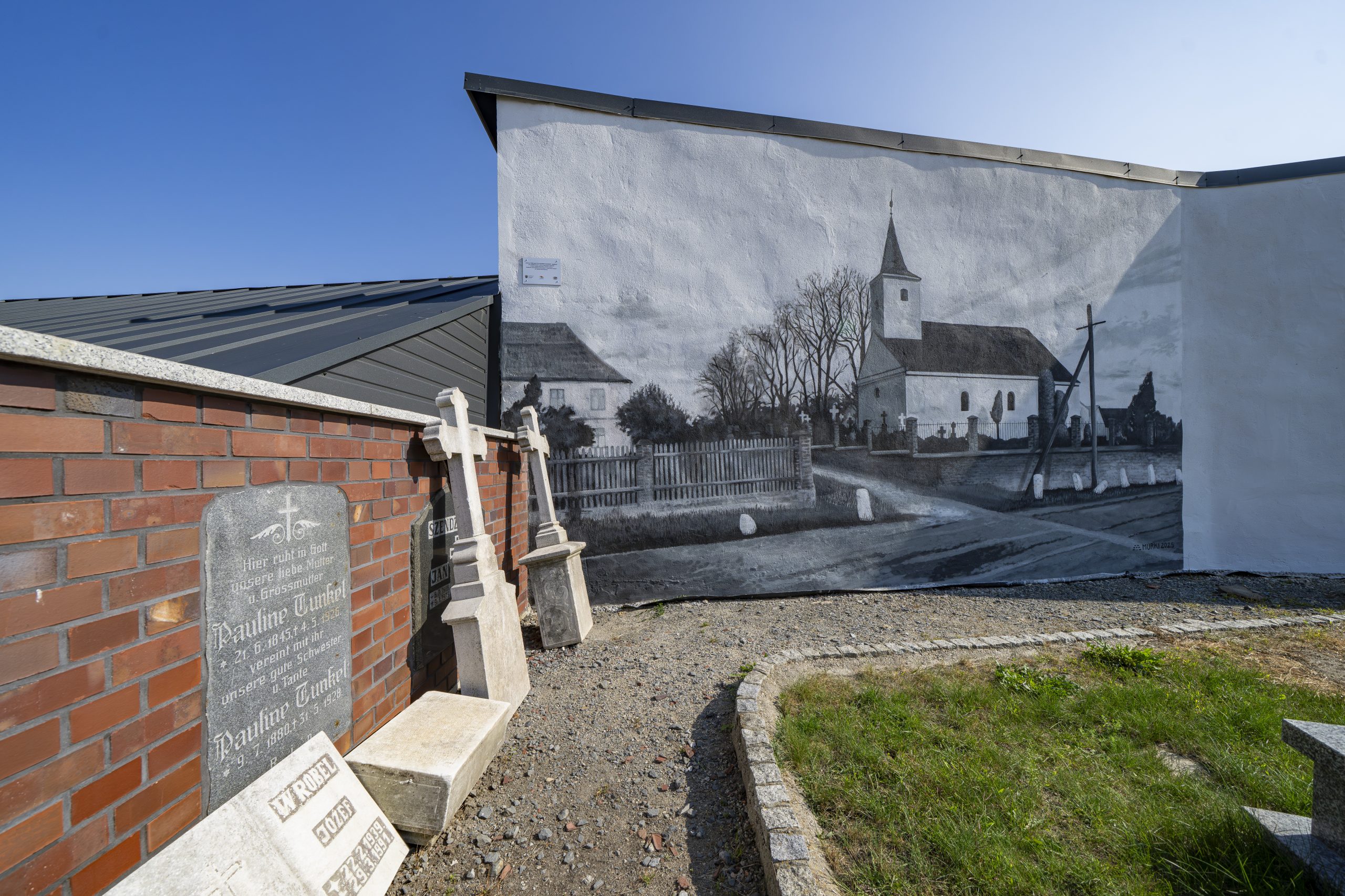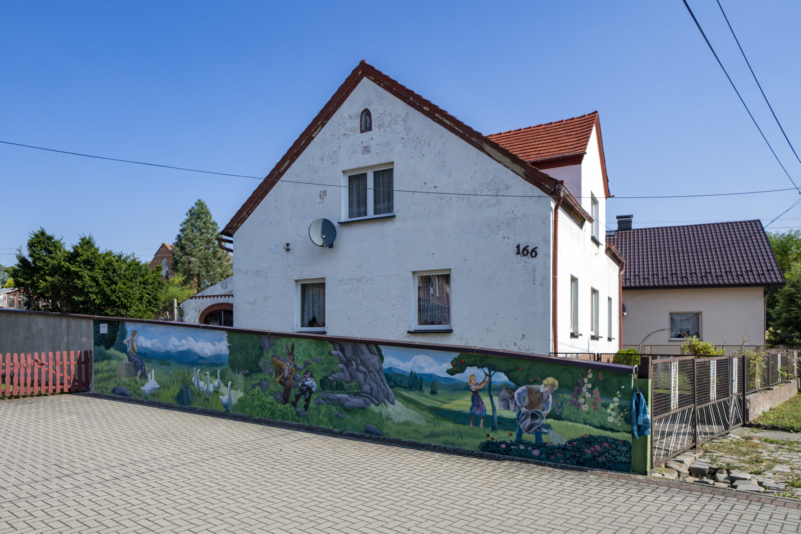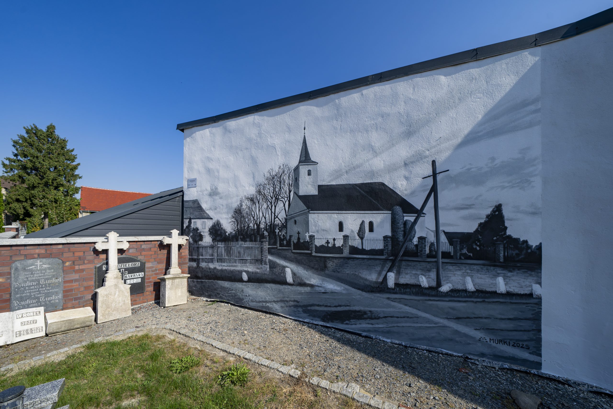 - Mural na ścianie szopy przylegającej do terenu kościoła parafialnego. Tematyka malowidła nawiązuje do archiwalnych fotografii zgromadzonych w „Farskiej Stodole”, ukazując m.in. wygląd świątyni sprzed rozbudowy oraz elementy śląskich tradycji funeralnych.