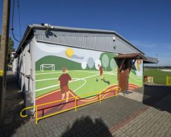 Centrum Aktywności Kulturalno – Sportowej zdobi mural nawiązujący do aktywności sportowej miejscowej młodzieży i dzieci pasjonującej się grą w piłkę nożną na boisku znajdującym się na tym terenie.