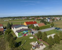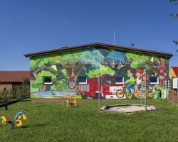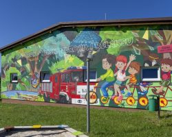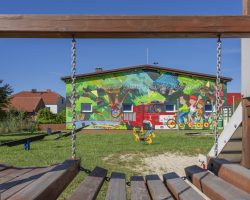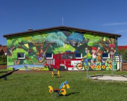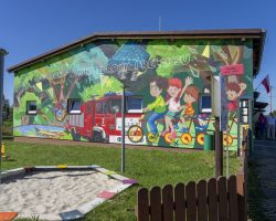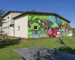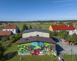 Mural zdobi Centrum Aktywności Wiejskiej, gdzie znajdują się świetlica wiejska, oddział przedszkolny, strażnica OSP, plac sportowo- rekreacyjny, plac zabaw, kącik bioróżnorodności i nawiązuje do tematu przewodniego wsi.