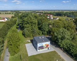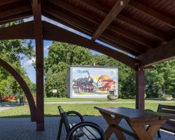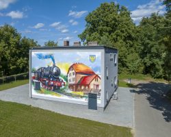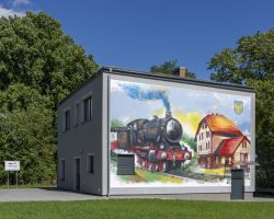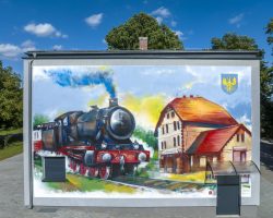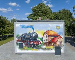 Kolorowy mural został umiejscowiony na budynku świetlicy wiejskiej , która znajduje się przy ścieżce rowerowej „Szlakiem Kolejowym”. Te kolorowe malowidło nawiązuje do dawnej funkcji budynku świetlicy- stacji PKP.